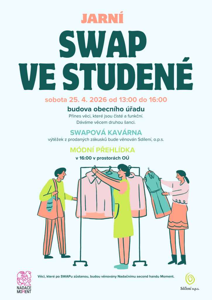 Zveme vás na jarní SWAP, který se uskuteční v sobotu 25. dubna 2026 od 13:00 do 16:00 hodin v budově obecního úřadu ve Studené. Přineste čisté a funkční věci, které už nepotřebujete, a dejte jim druhou šanci. V rámci akce proběhne také swapová kavárna, jejíž výtěžek z prodaných zákusků bude věnován organizaci Sdílení, o.p.s.